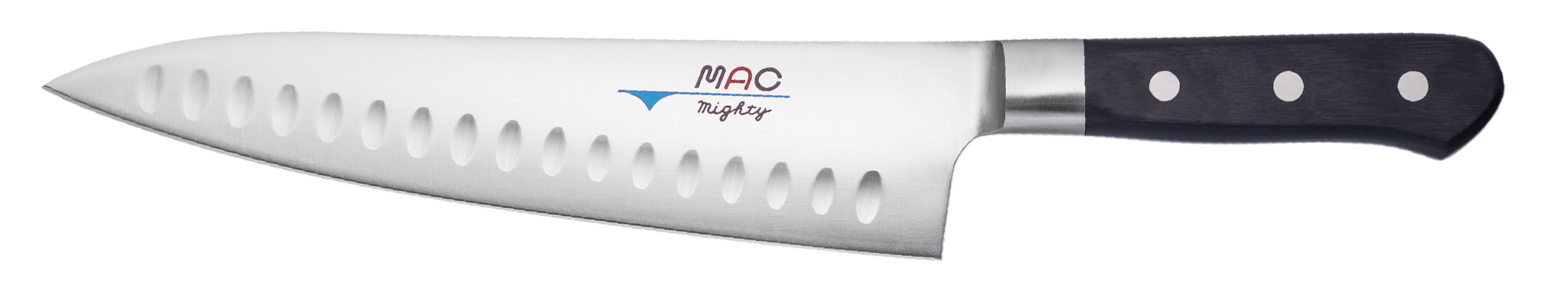 Knivene er laget av rustfritt molybden høykarbonstål, med en hardhet på 57–61 HRC, noe som gir en perfekt balanse mellom skarphet og enkelt vedlikehold. De håndslipes på vannkjølte steiner for å gi et sylskarpt resultat som varer. Mange brukere opplever at MAC-kniver holder seg skarpere lenger enn flere av de mest kjente konkurrentene på markedet.