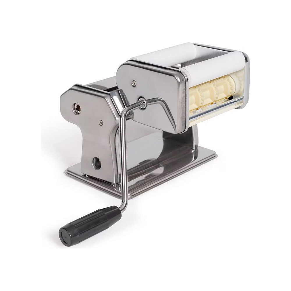 9-posisjons valse fra 6 til 1 mm for fettuccine, spaghetti, lasagne og ravioli - Rustfritt stål for profesjonell kvalitet - 1 pastaskjæretilbehør - 1 sveiv - 1 ravioliform: stripe med 3 raviolis i bredden